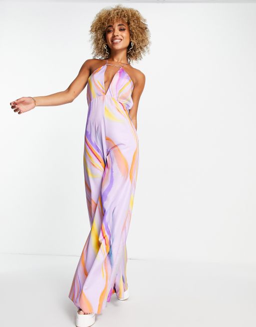 Asos Design Satin Halter Neck Strappy Jumpsuit With Tie Back Detail In Coloured Abstract Marble Asos